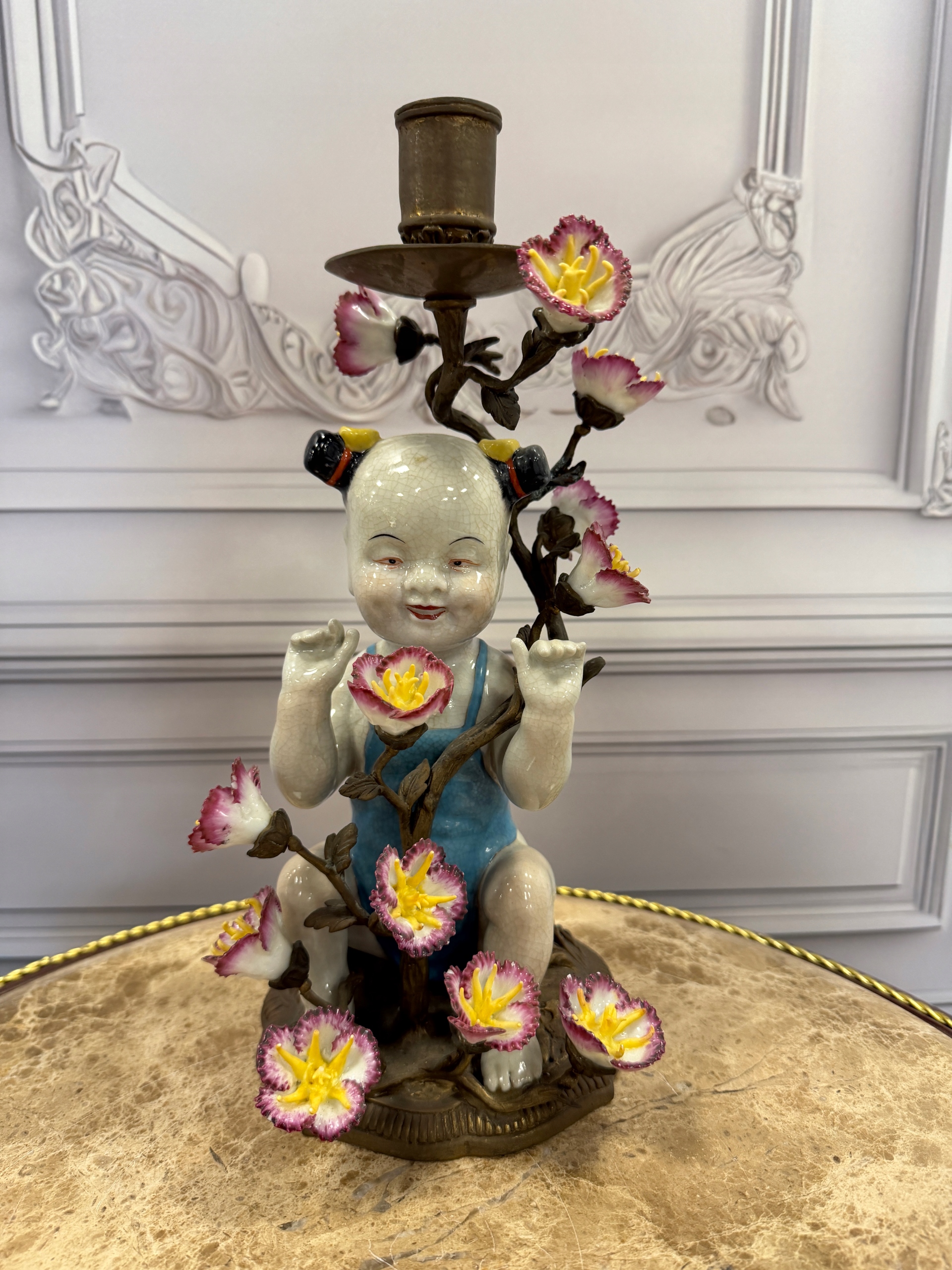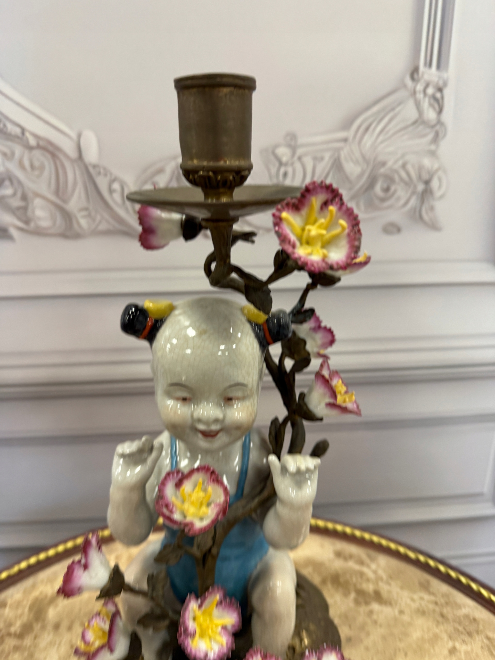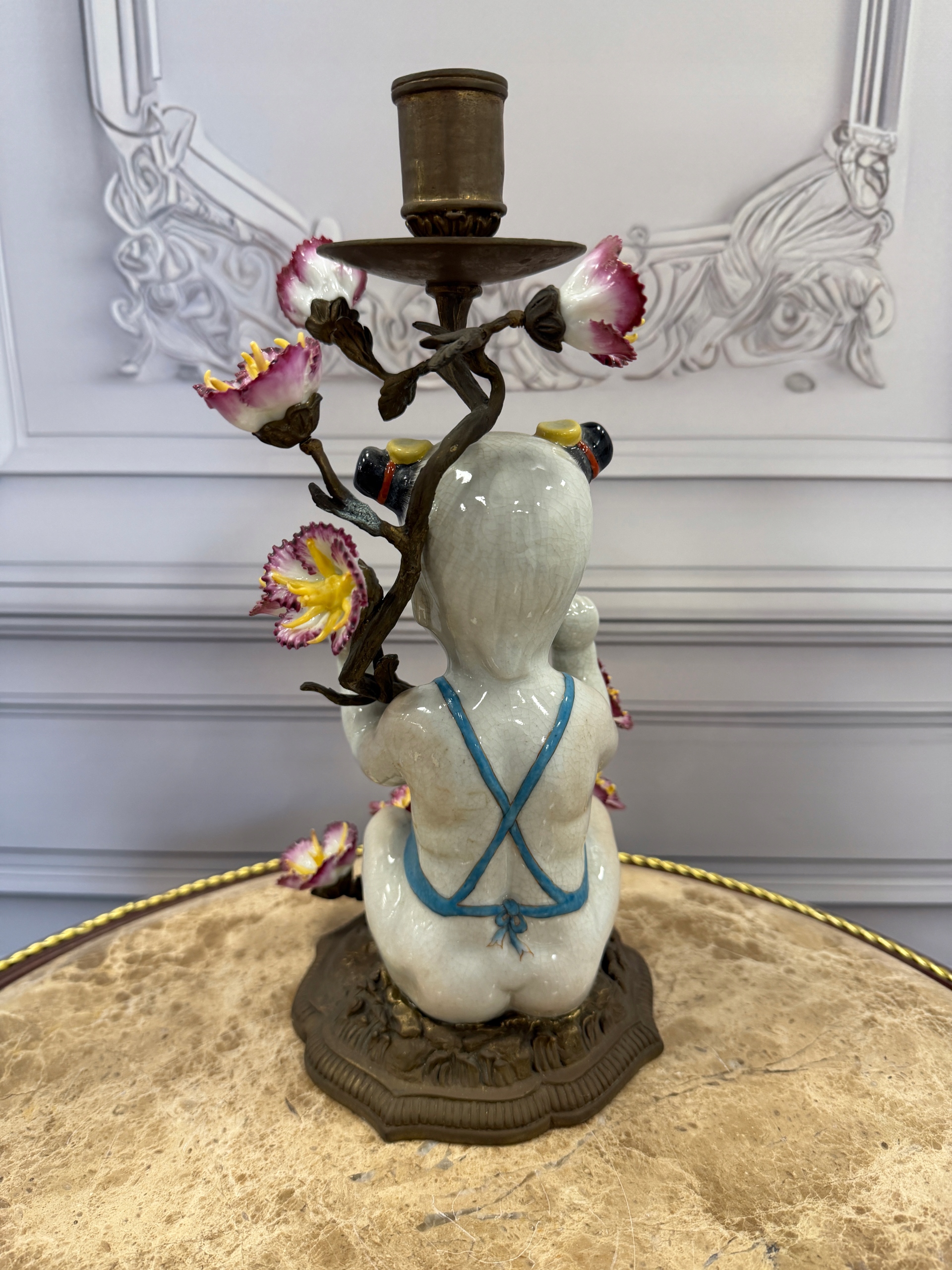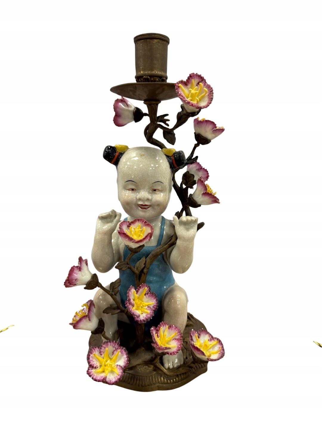 Świecznik z brązu postaciowy -porcelana